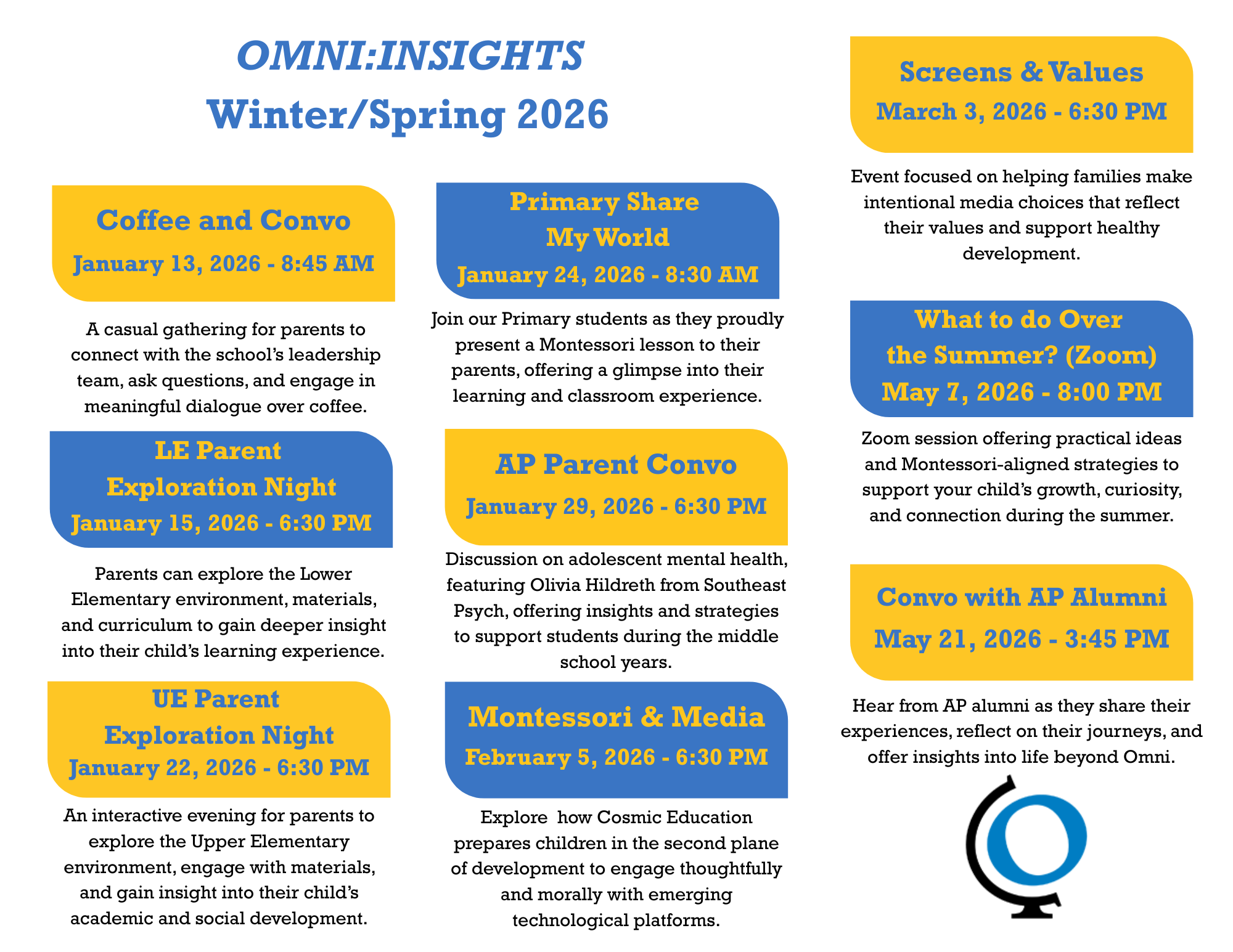 OMNI:INSIGHTS is a series of programs and events designed to support parents at Omni Montessori School. Topics include Montessori principles and practices and child development. These events provide Omni parents with opportunities to share their experiences with other parents at the school. View the OMNI INSIGHTS calendar HERE. Details of each event will be emailed to parents.